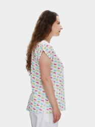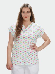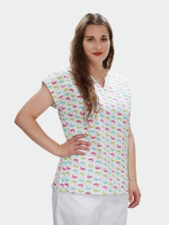 Bílá zdravotnická halena (vzor chameleon) vykouzlí úsměv na tvářích nejen dětských pacientů. Halena je ušitá z bavlněného plátna. Ženy a dívky oceňují spadené rukávy a tvarovaný výstřih, který vyhovuje zejména těm, co nemají rády „véčka“. Samozřejmostí jsou 2 spodní kapsy a 1 kapsa náprsní.