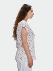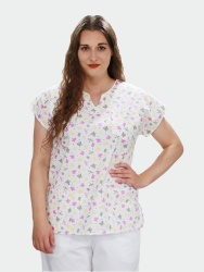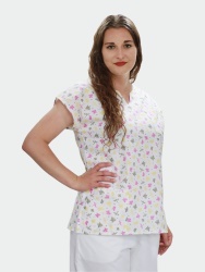 Bílá zdravotnická halena se vzorem motýlů vykouzlí úsměv na tvářích nejen dětských pacientů. Halena je ušitá z bavlněného plátna. Ženy a dívky oceňují spadené rukávy a tvarovaný výstřih, který vyhovuje zejména těm, co nemají rády “véčka”. Samozřejmostí jsou 2 spodní kapsy a 1 kapsa náprsní