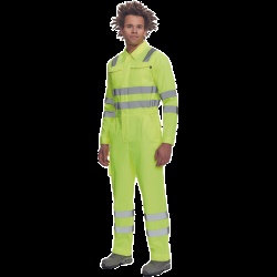 • pánský lehký full HI-VIS pracovní overal s reflexními pruhy přes ramena, v bocích, na rukávech a nohavicích • elastický pas, zapínání na zip kryté légou na suchý zip • 2 postranní kapsy, 1 kapsička na mince • 1 multifunkční stehenní kapsa • 2 náprsní kapsy s klopou • 2 zadní kapsy • nastavitelná délka nohavic.