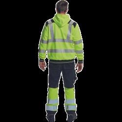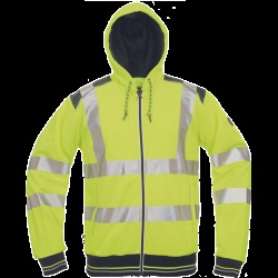 • HI-VIS celopropínací mikina s kapucí ze směsového úpletu polyesteru a bavlny • sedlo v kontrastní černé barvě lemované reflexní paspulkou • dvouvrstvá kapuce se stažením na šňůrku • 600D Oxford zesílená oblast ramen • tištěné 5 cm reflexní pruhy • 2 boční kapsy • elastické náplety na rukávech a v pase.