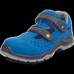 Bezpečnostní sandál v moderní modro-černe barevné kombinaci. Svršek obuvi je vyrobený z mikrovlákna a perforovaný po cele délce. Protiskluzová podešev odolná olejům je vyrobena z polyuretanu a transparentního termopolyuretanu. Podešev zajišťuje nejenom komfort ale také maximální jistotu při každém kroku. Obuv je vybavena komfortní, perforovanou vnitřní stélkou, která garantuje pohodlí a cirkulaci vzduchu uvnitř boty. Absorpce energie v oblasti paty tlumí nárazy a omezuje pocit únavy nohou. Díky bezpečnostní kompozitní tužince splňuje obuv požadavky normy EN ISO 20345:2011. To znamená, že chodidla jsou chráněna před stlačením silou do 15 kN nebo pádem břemena o vaze do 20kg z výšky 1m. Chodidla jsou chráněna také ze spodu a to díky kompozitní stélce proti propichu. Obuv neobsahuje kovové součásti a je vybavena funkcí ESD. Proto je to ideální model pro vnitřní prostory a citlivé prostředí, kde je potřeba zabránit vzniku jisker z elektrostatického výboje anebo pro prostory vybavené bezpečnostním rámem. Obuv bude vhodná pro zaměstnance s vysokým nártem, protože díky velice pohodlnému zapínaní na suchy zip je možné přizpůsobit svrchní část obuvi přesně na míru a tímto dosáhnout maximálního komfortu během práce. Bez kovu
