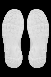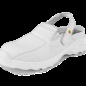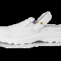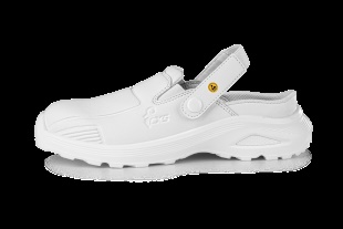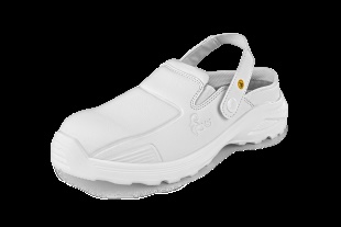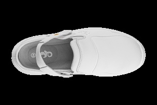 Bílý nazouvák s polohovatelným patním páskem, ESD vlastnostmi a antibakteriální úpravou Sanitized. Materiál: svršekz hladkého mikrovlákna jednoduchého na údržbu. Podšívka z prodyšné síťoviny a odolného mikrovlákna. Stélka: komfortní HI-POLY. Podešev: PU, antistatická, olejivzdorná, protiskluzová.