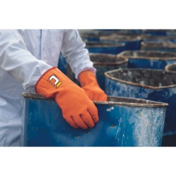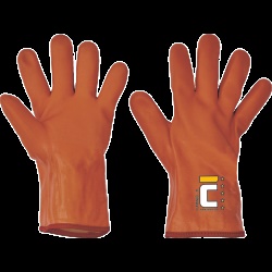 • rukavice šité z bavlněného úpletu • máčené v PVC • s polyuretanovou vložkou a podšívkou z teplákoviny • v celkové délce 30 cm.