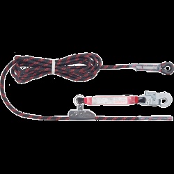 • pohyblivý zachycovač pádu na poddajném zajišťovacím vedení (lano) • PA pletené lano s ø 12 mm na horním konci šitým okem s očnicí a karabinou AZ 002 (otevření 18 mm), dolní konec šitý bez oka • na pohyblivém zachycovači pádu je tlumič pádu s karabinou AZ 002 (otevření 18 mm)